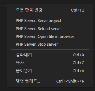 4. VS Code를 다시 시작 후, "php" 파일에서 우클릭하여 "PHP Server: Serve project"를 클릭해보세요.