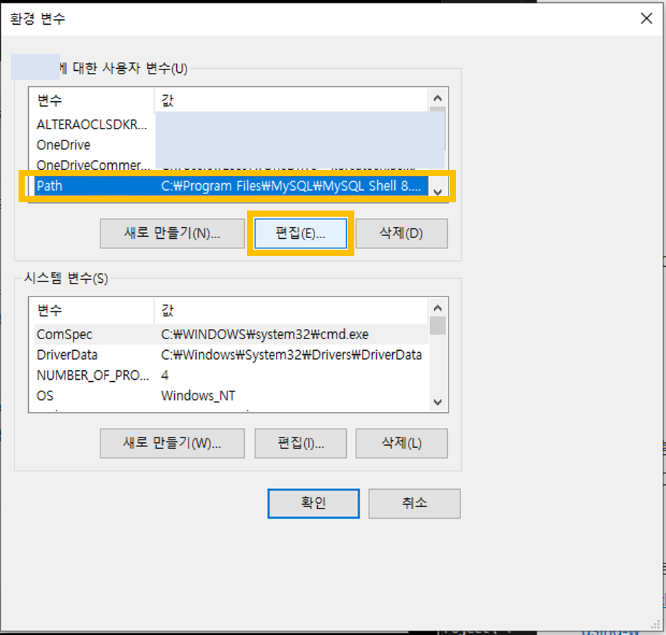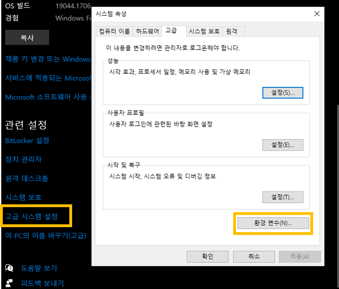 위치: 내 PC/속성/고급 시스템 설정/환경 변수