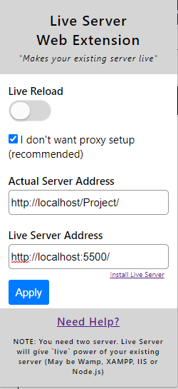 3. "Apply"를 눌러 적용해주시고, Live Reload를 클릭하여 동작시켜주세요.