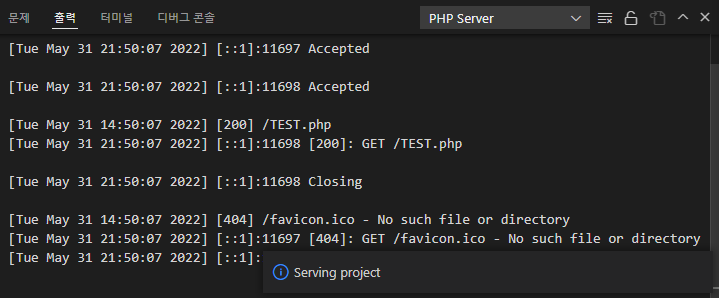 그럼 이제 아래와 같이 "Serving project" 서버가 정상적으로 구동되며, 웹브라우저 창에 php 내용이 출력되는 것을 확인하실 수 있습니다.