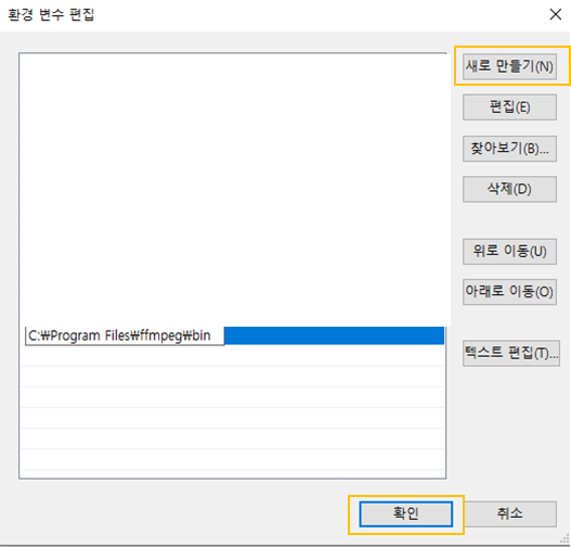 어느 위치에서든지 "cmd"를 이용해 ffmpeg를 사용하기 위해서는 ffmpeg.exe 위치를 Path 환경 변수로 등록해주어야 한다. Path: C:\Program Files\ffmpeg\bin