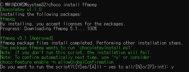 관리자 모드로 "cmd"를 실행하여 아래의 명령어를 통해 FFmpeg 패키지를 설치해준다.