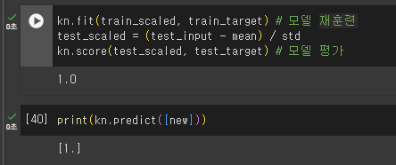 - KNeighborsClassifier(): k-최근접 이웃 분류 모델을 만드는 사이킷런 클래스