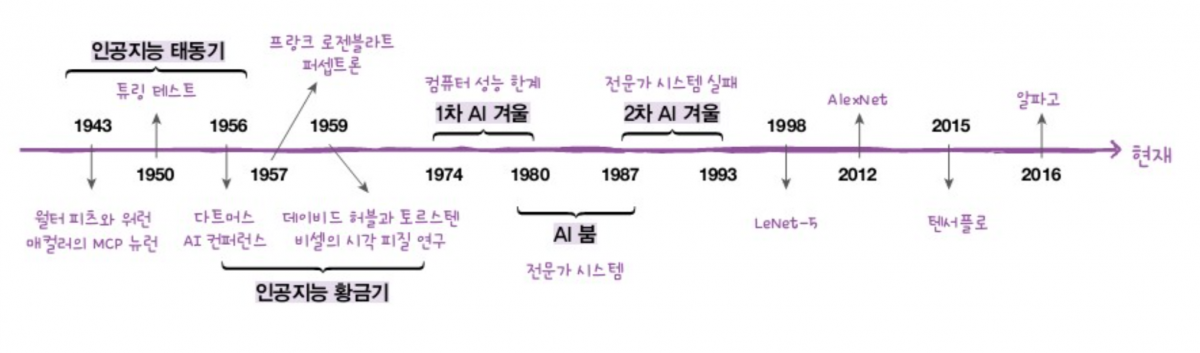 위 3가지는 이 책 뿐만 아니라, 2016년 3월 알파고나 나온 이후로 ChatGPT와 함께 대중들이 한 번쯤 들어봤을 용어이다. 하지만, 전공자가 아닌 이상 이 셋을 명확히 구분하기는 힘들 것이다. AI의 학술적인 이론은 1943년부터 나온 이론으로서 인간의 뇌를 모방하여 뉴런을 컴퓨터 시스템으로서 구현하여 말 그대로 인공적인 자아를 만드는 데 있다. 결국 인공지능이라는 것은 사람처럼 학습하고 추론할 수 있는 지능을 가진 컴퓨터 시스템을 만드는 기술을 총칭한다.