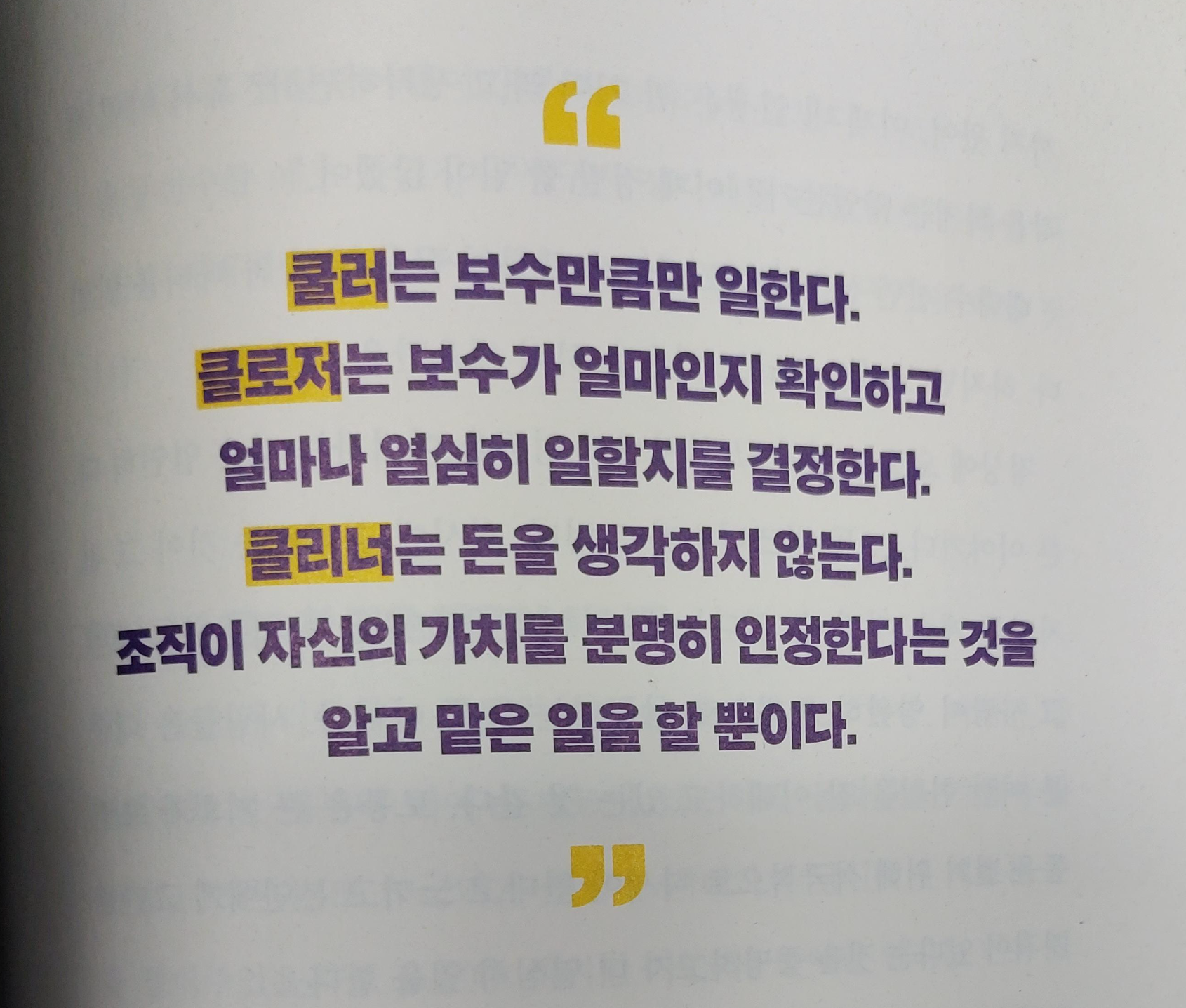 나는 이 문구를 보고는 난 아직 멀었구나, 라는 느낌을 받았다. 요즘 MZ들 보면 대부분이 보수만큼만 일해야지 이러고는 하는데 다들 쿨러 수준 밖에 안 되는 것이었다. 진정한 클리너라면 자신의 가치 자체에 대해 생각해야 한다는 것을 깨달을 수 있었다.
