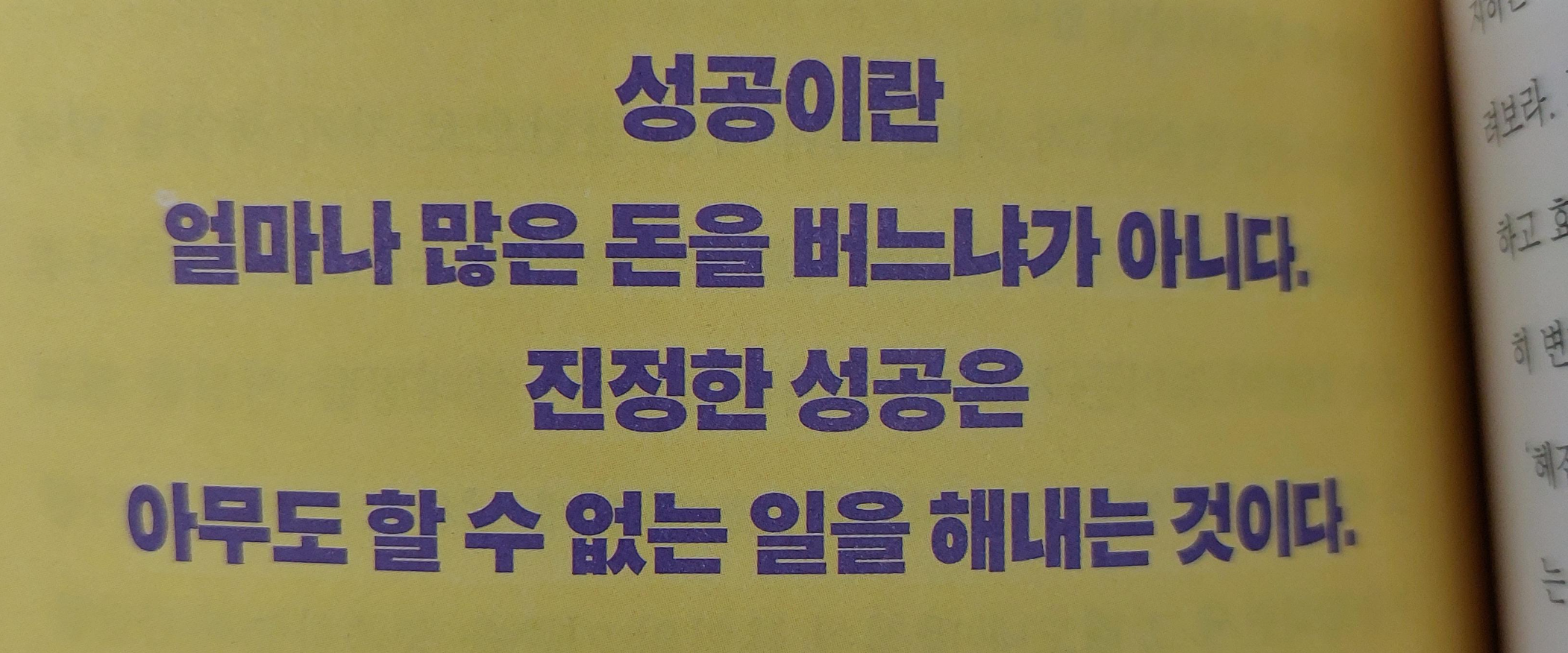이 외에도 마음에 와닿았던 문구로 “성공이란 얼마나 많은 돈을 버느냐가 아니다. 진정한 성공은 아무도 할 수 없는 일을 해내는 것이다.” 가 있었다. 첫 직장이어서 더더욱 근로 계약서 상에 연봉이 얼마나 나오나 신경이 많이 쓰였다. 누구나 그럴 것이다. 하지만, 그토록 갈망해 왔던 성공은 ‘돈’으로 결정되는 것이 아닌 대체 불가능한 사람이 되는 것이라는 것을 떠올리며 ‘멘탈’을 부여잡을 수 있었다.