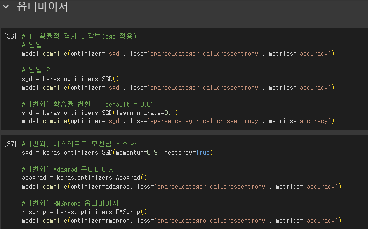 - metrics 매개변수: 훈련 과정에서 측정하고 싶은 지표 지정