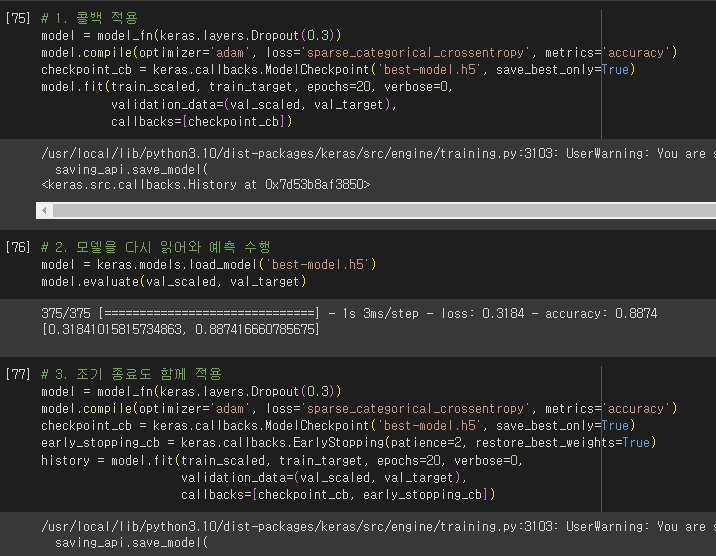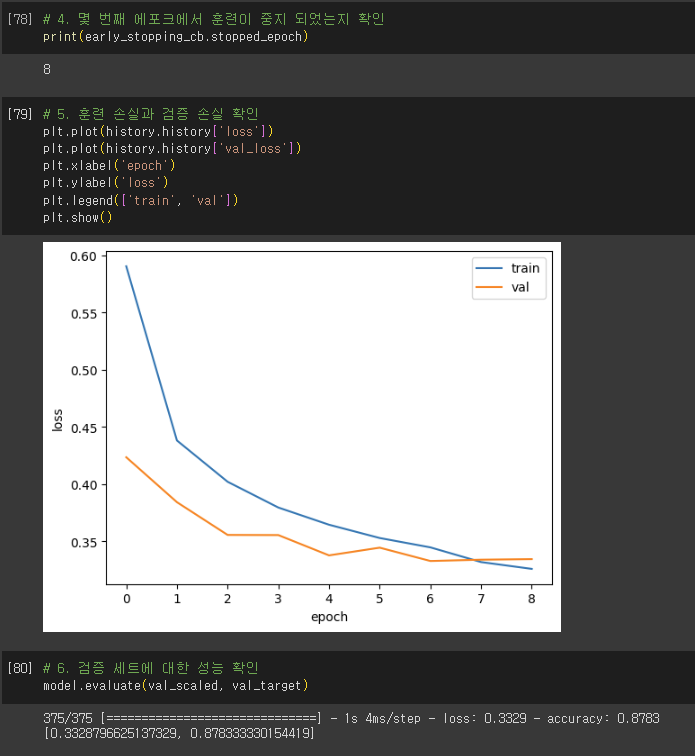 - restore_best_weights 매개변수: 최상의 모델 가중치를 복원할 지정