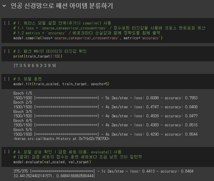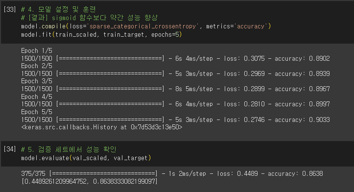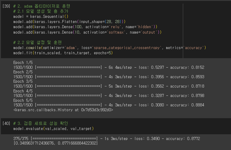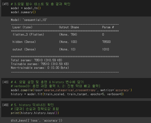 - compie() 메서드에서 loss 매개변수에 지정한 손실 함수의 값과 metrics 매개변수에서 지정한 측정 지표 출력