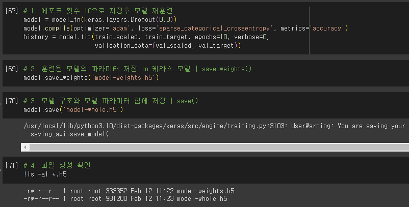 - save(): 모델 구조와 모든 가중치와 절편을 파일에 저장