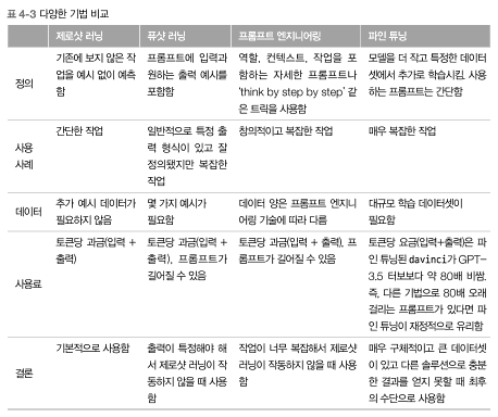 4장은 모델 성능 향상을 위해 사용되는 기법인 튜닝에 대해 중점적으로 다루었다. 앞장에서 파인 튜닝이라는 용어가 정말 많이 등장하는데, 인공지능을 이 책을 통해 처음 접하는 독자였다면 ‘파인 튜닝’이 뭐지? 하는 궁금증을 가지고 계속 책을 읽었을 것으로 우려가 된다. 따라서, 현재의 책 구성도 좋지만 앞 장에서는 인공지능 용어에 익숙하지 않은 독자들을 위해 용어에 대한 주석도 더 추가되면 좋겠다는 느낌을 받았다. 4장에서 다룬 파인 튜닝, 퓨샷 튜닝, 원샷 튜닝 등의 기법들은 GPT-4 사용이 필요하여 직접 실습은 못해보았지만 튜닝에 대한 전반적인 소개와 이해를 마지막 정리된 표를 통해 확실히 알아갈 수 있었다. 그리고 프롬프트 엔지니어링에 대해서는 컨텍스트, 역할, 작업으로 나뉘는 프롬프트 문에 대해서도 보다 깊은 이해와 LLM을 다루는 데 있어 ‘질문의 중요성’을 새삼 느낄 수 있었다.