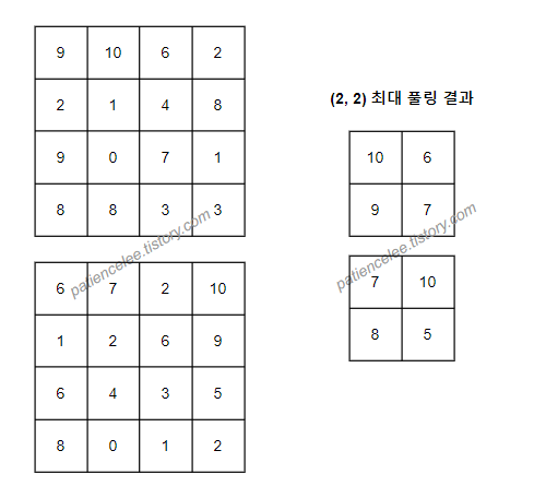 - 최대 풀링(max pooling): 도장을 찍은 영역에서 가장 큰 값을 고름