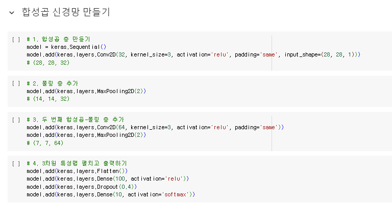 - activation 매개변수: 합성곱 층에 적용할 활성화 함수 지정