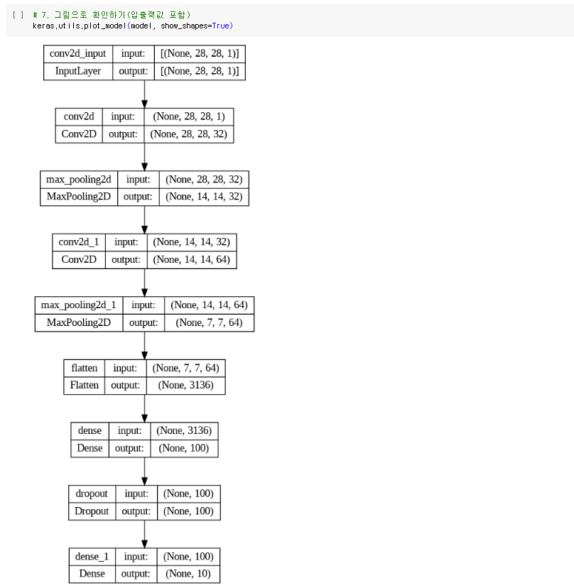 - 그리고 마지막에 출력층 전에 특성 맵을 모두 펼쳐서 밀집층의 입력으로 사용한다.