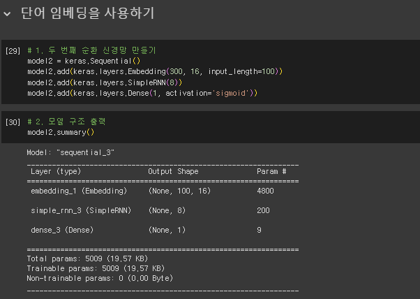 - 두 번째 매개변수: Embedding 층이 출력할 밀집 벡터의 크기 지정