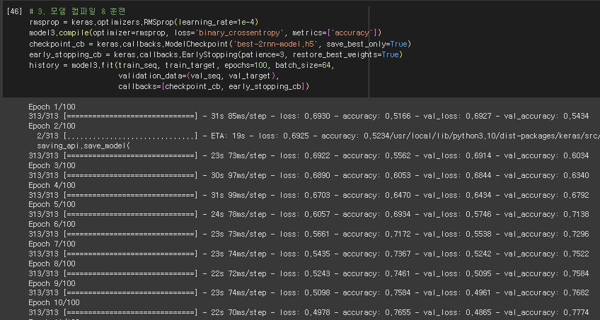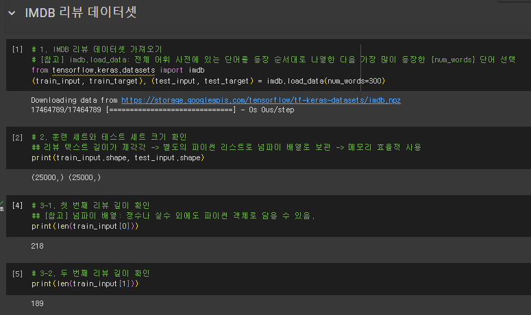 - 텐서플로를 사용해 순환 신경망을 만들어 영화 리뷰 데이터셋에 적용해서 리뷰를 긍정과 부정으로 분류합니다.