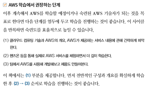 메인 컬러를 주황색으로 가져간 것부터가 눈에 띄었는데, 내용 구성도 탄탄했습니다. 여느 책들과는 다르게 AWS를 어떻게 공부해야 하는지 차근차근 설명부터 해주었습니다. 책에 다른 소개 부분도 좋았지만, 서두에 이러한 내용이 있어 일전에 학습이 어려웠던 저로써는 계획을 수립하는데 굉장히 도움이 되었습니다.