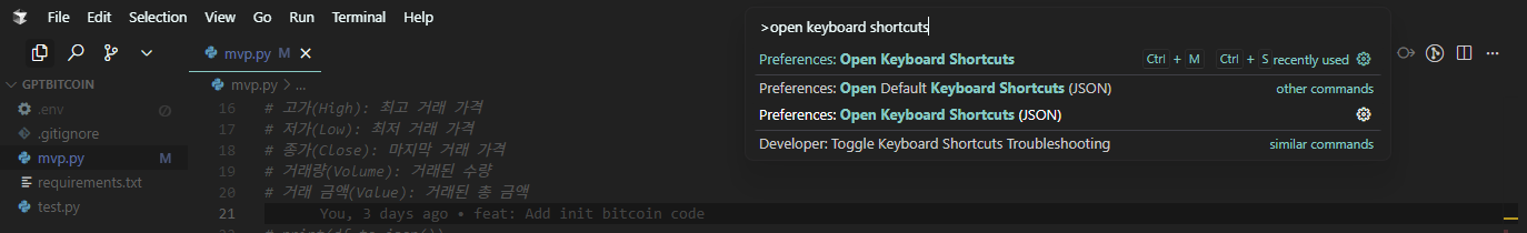 1. Curosr IDE 에서 'Ctrl + Shift + P'를 누른 뒤, 'Open Keyboard shortcuts'을 검색해주세요.