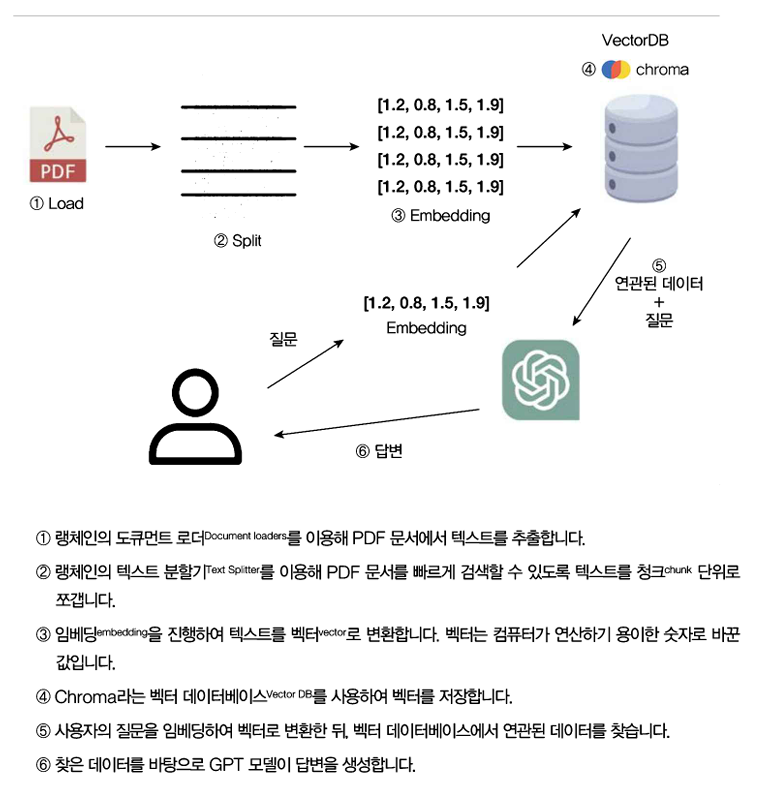특히 Part 3의 'ChatPDF 만들기' 챕터에서는 도큐먼트 로더, 텍스트 분할기, 임베딩, 벡터 저장소, 검색기, 생성기의 역할을 각각 명확히 구분하여 설명하고, 이들이 어떻게 연결되어 하나의 서비스를 구성하는지를 체계적으로 보여준다.