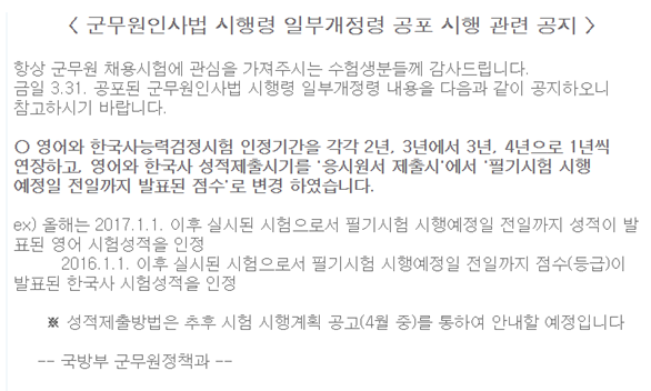 군무원은 필기 응시과목 중 영어와 국사시험을 각각 공인인증 영어시험과 한국사능력검정시험 성적으로 대체할 수 있는데요. 이는 본래 2년과 3년이라는 기한이 있었고, 성적제출시기도 '응시원서 제출시'까지 였습니다.
