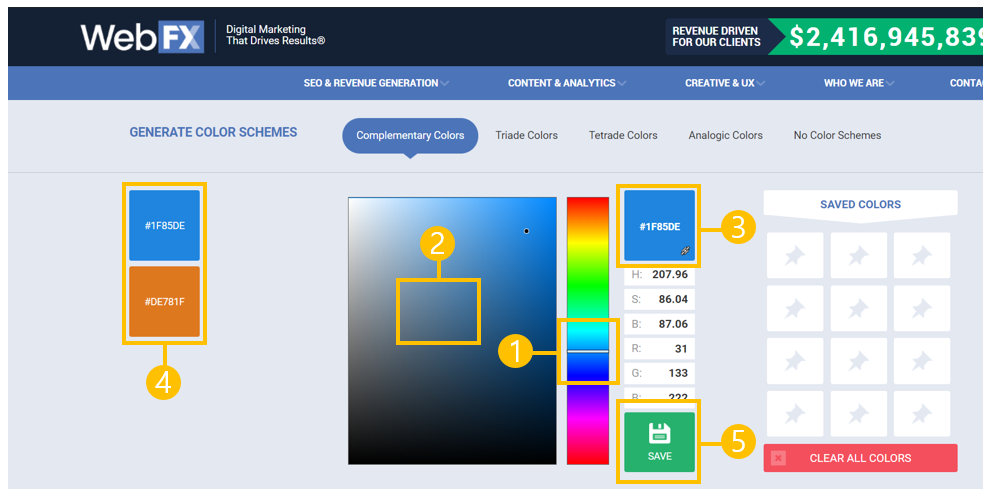 - 클릭하면 선택한 색상을 오른쪽 'SAVED COLORS' 목록에 추가할 수 있습니다
