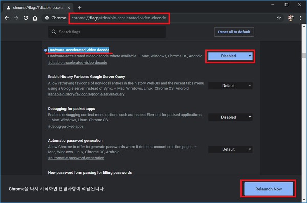 방법은 어렵지 않은데 크롬의 주소 창에 chrome://flags/#disable-accelerated-video-decode를 입력하고 최상단에 Hardware-accelerated video decode라는 옵션이 보이는 페이지가 나타나면 해당 옵션을 Disabled로 변경하고 크롬을 재시작하면 된다.