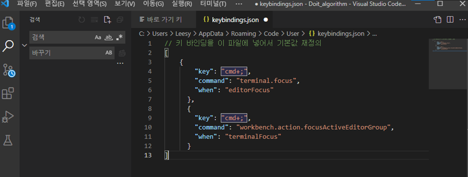 누르면 keybindings.json이 열리고,