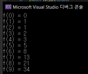 0~9까지의 피보나치 수열을 구하여 화면에 표시하는 데 있어서는 for 반복문을 활용해보았습니다.