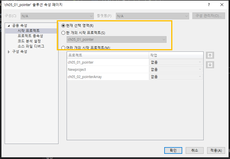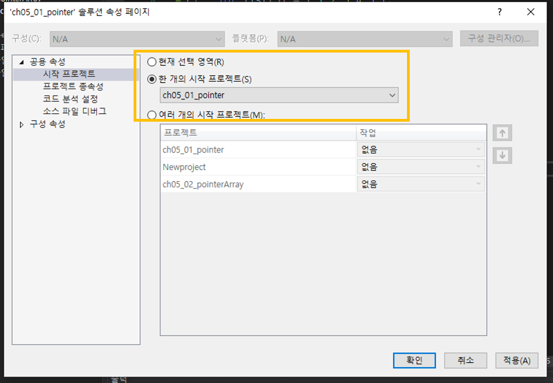 기본 설정 값이 한 개의 시작 프로젝트로 설정되어 있으실 겁니다.