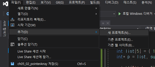 1. 파일 - 추가 - 새 프로젝트로 들어갑니다.