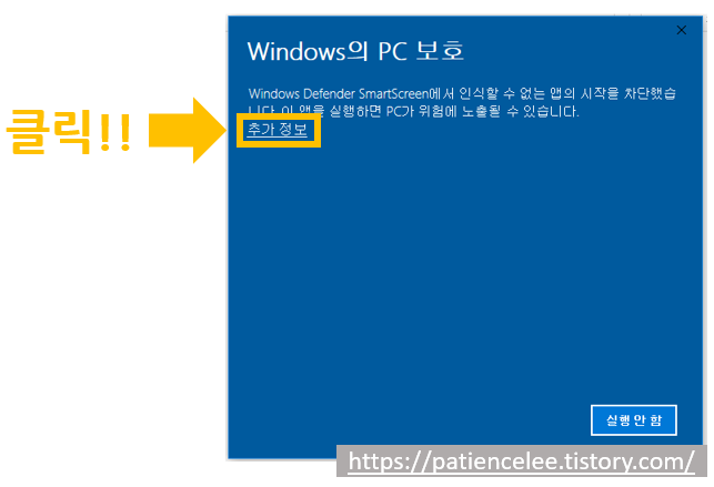 1. PC 보호 창의 "추가 정보" 항목을 누른 후 "실행" 버튼 클릭